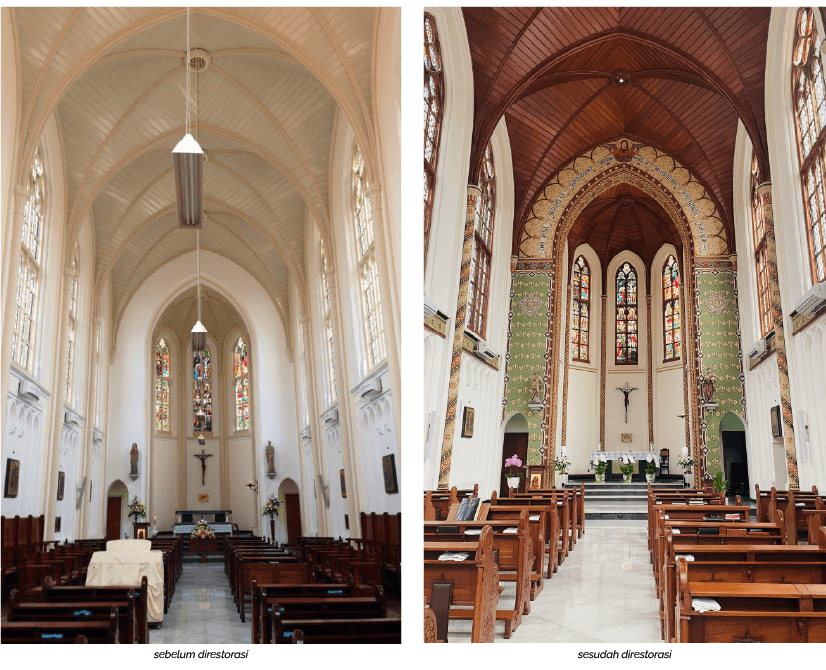 Michaela Anselmini pemilik Art Restoration Studio & Ruang Rawat Seni, restorasi asal Italia yang sering merestorasi lukisan tua di Yayasan Tirto Utomo, membantu membentuk tim restorasi khusus untuk menangani temuan ini. Riset dilakukan selama ber bulan-bulan dengan mencari arsip-arsip juga dengan bantuan Suster Fransesco. Sepuluh pelukis mural muda dilibatkan untuk menghidupkan kembali fresco yang hilang. Bahan-bahan pengecatan didatangkan dari Eropa untuk memastikan keakuratan restorasi. Kursi-kursi lama tetap digunakan, sementara spesialis pencahayaan Hadi Komara diberi arahan untuk menciptakan suasana gothic yang kuat dengan teknik pencahayaan tersembunyi.